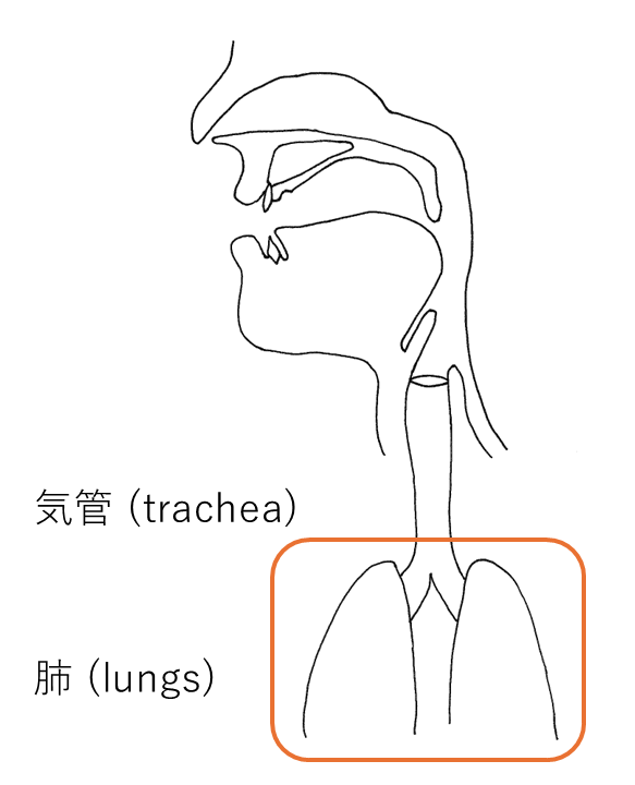 音声の産出において,気流は多くの場合,呼気(すなわち,肺から息を吐くこと)により生み出されます。なお,呼気以外のメカニズムによる気流がかかわる音もありますが,これについては「放出音・入破音・吸着音」のページで説明します。